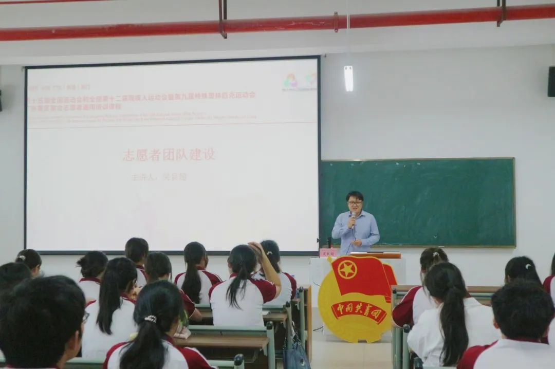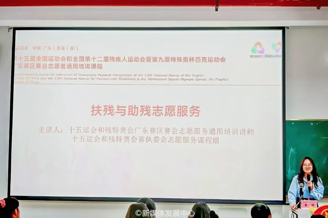课程2:全运会、残特奥会概括与志愿者岗位介绍。4月19日,在肇庆校区16号楼104,我校团委干事何以立以《全运会、残特奥会概括与志愿者岗位介绍》为题,通过影像资料与数据图表生动展现两大赛事的发展脉络与社会价值,并详细介绍了全运会、残特奥会志愿者的种类及各自的岗位职责,让志愿者们系统地了解志愿服务工作的要求及志愿者的责任与使命,以期更加准确地匹配十五运会和残特奥会志愿服务相关工作需求。