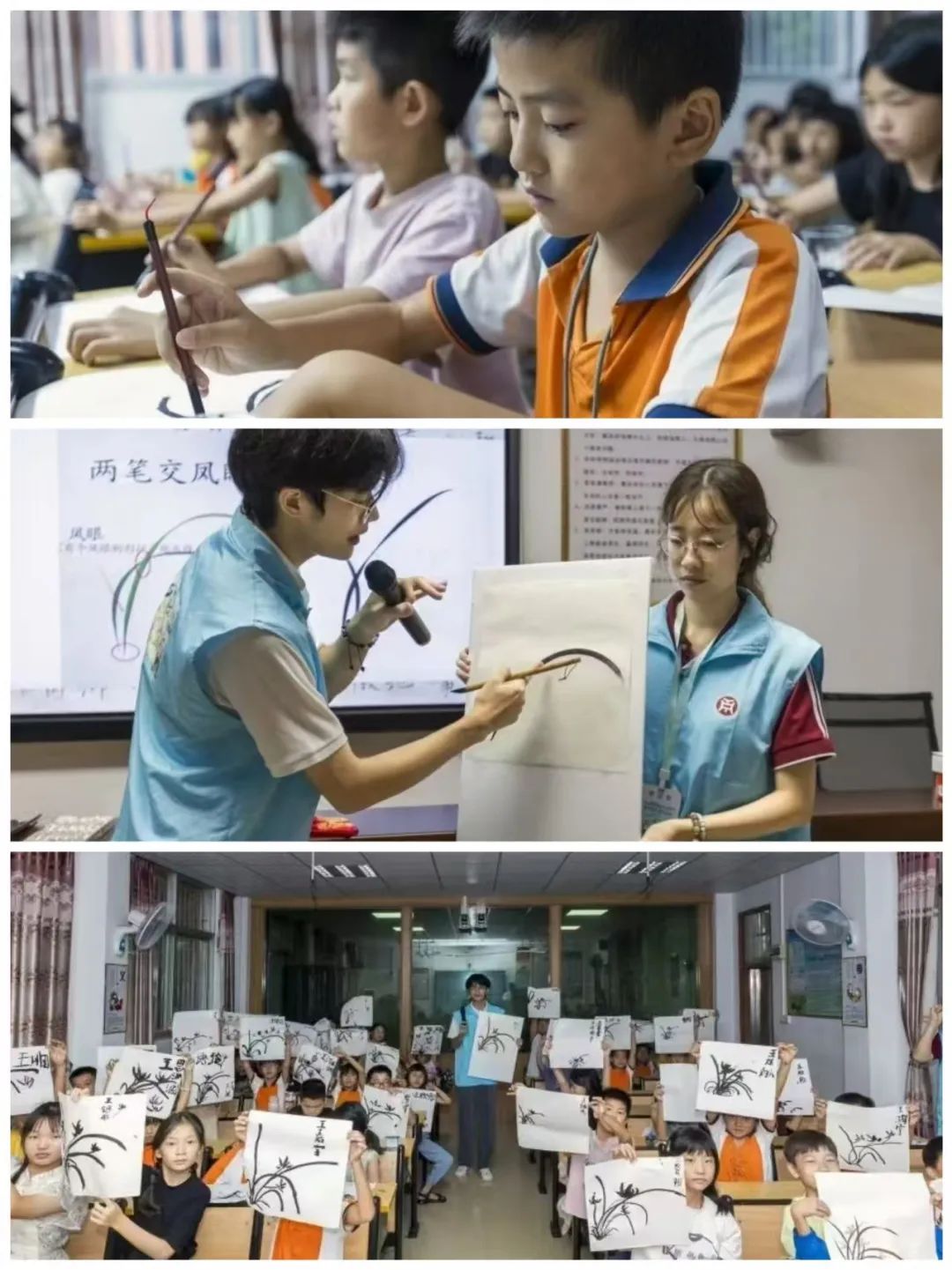 “印象潮汕”书画课的开场由一场“触感传书”的互动游戏开始,瞬间点燃课堂的热情。学生们凭借指尖余温猜字形,细微的触感如同流动的密码,在队列中悄然传递,这份新奇的体验让书法在学生们心中埋下了好奇的种子。实践团志愿者化身书法引路人,带领学生走进笔墨的世界。从“身正腰直”的坐姿要领,到“指实掌虚”的握笔秘诀,再到提、按、顿、挫的运笔变幻,每一个细节都被拆解成生动的示范。志愿者握着学生们的手在宣纸上轻舞,墨痕或浓或淡,或急或缓。笔端起落间,学生们渐渐体味到书写本身的韵律与沉静。