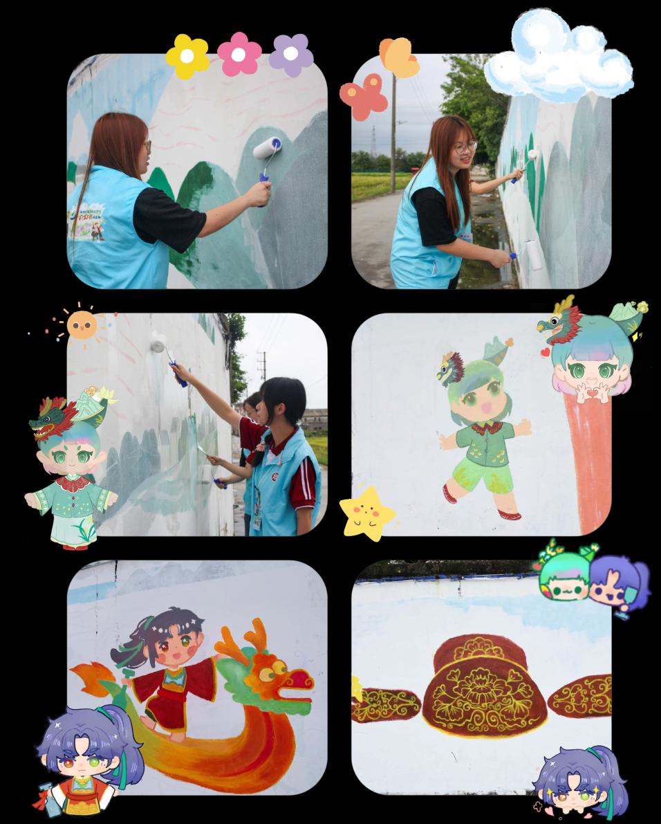 潮跃墙面,再添新颜。实践团志愿者组织开展潮汕元素墙绘活动,专注勾勒绣状元帽轮廓,确保其形态精准呈现。依据设计标准把控色彩浓淡,以准确展现潮汕元素的独特韵味。在团队IP形象萤舟舟和舟小阳的绘制环节,志愿者巧妙将龙舟元素融入到IP形象主体中,实现IP形象与揭阳龙舟文化的有机融合。龙舟图案的绘制力求充分展现揭阳龙舟的灵动与气势。