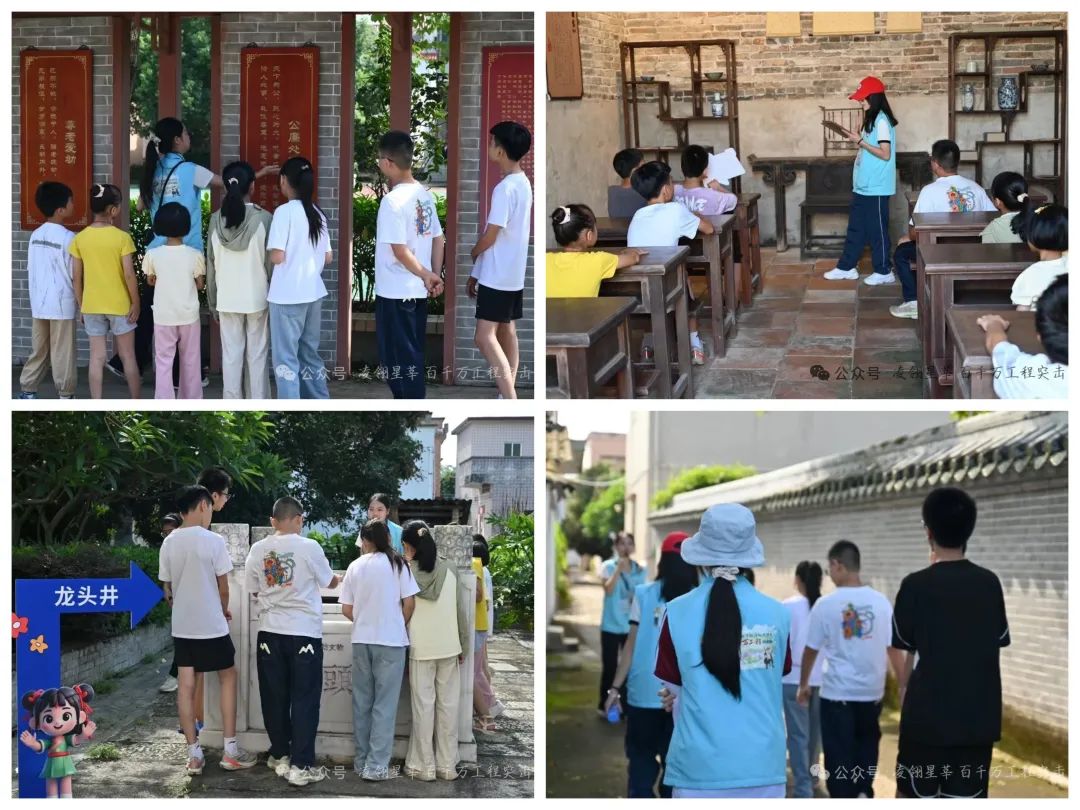 实践队依托龙头村丰富的历史文化资源,精心设计了“浩然楼—卢氏家风家训长廊—卢氏宗祠—龙头井—联芳里建筑群—百年大榕树”的文化研学路线。队员们化身“文化向导”,结合史料记载与民间传说,向孩子们系统讲解各点位的历史脉络:在浩然楼解析其作为乡村文化地标的时代价值,在卢氏宗祠讲述家族变迁与繁衍的奋斗历程,在龙头井阐释“饮水思源”的民俗寓意,在百年大榕树下解读“守望相助”的村落精神。