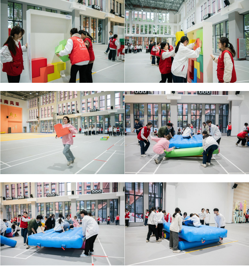 活动现场气氛热烈,学员们精神饱满、配合默契,在充满趣味的竞赛项目中充分展现了团结协作的力量。“鸿运通天”考验着团队的平衡与协调能力,学员们手持长杆,步伐一致,共同托举象征集体荣誉的彩色圆球稳步向前;“超级战车”项目中,队员们紧密协作,以手脚并用的方式推动“战车”在赛道上疾驰,速度与默契缺一不可;在“俄罗斯方块(积木款)”环节,大家争分夺秒、头脑风暴,以最快速度完成巨型积木拼搭,生动诠释了策略与执行的结合;而“猛龙过江”更是将气氛推向高潮,队员们骑在充气龙舟上协力前进,整齐的口号与奋力的动作彰显出青春的昂扬斗志。