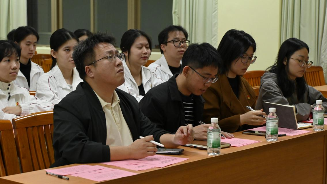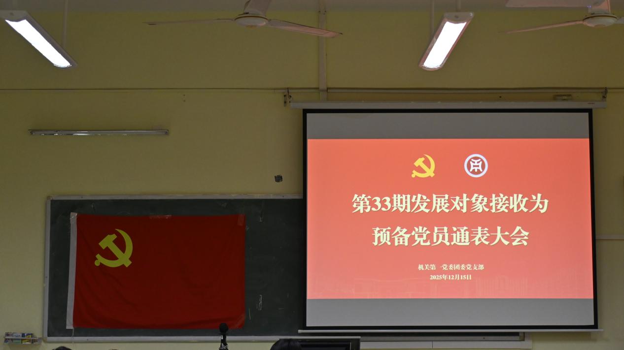 2025年12月15日下午18:00,机关第一党委团委党支部于启智楼202召开第33期发展对象接收为预备党员通表大会。参加本次大会的人员有:支部书记陈刚同志、支部正式党员、支部预备党员。大会由彭仪琳主持,主要议程包括:一、集中学习中央经济工作会议;二、讨论并表决李思莹等8名同志转为中共预备党员。