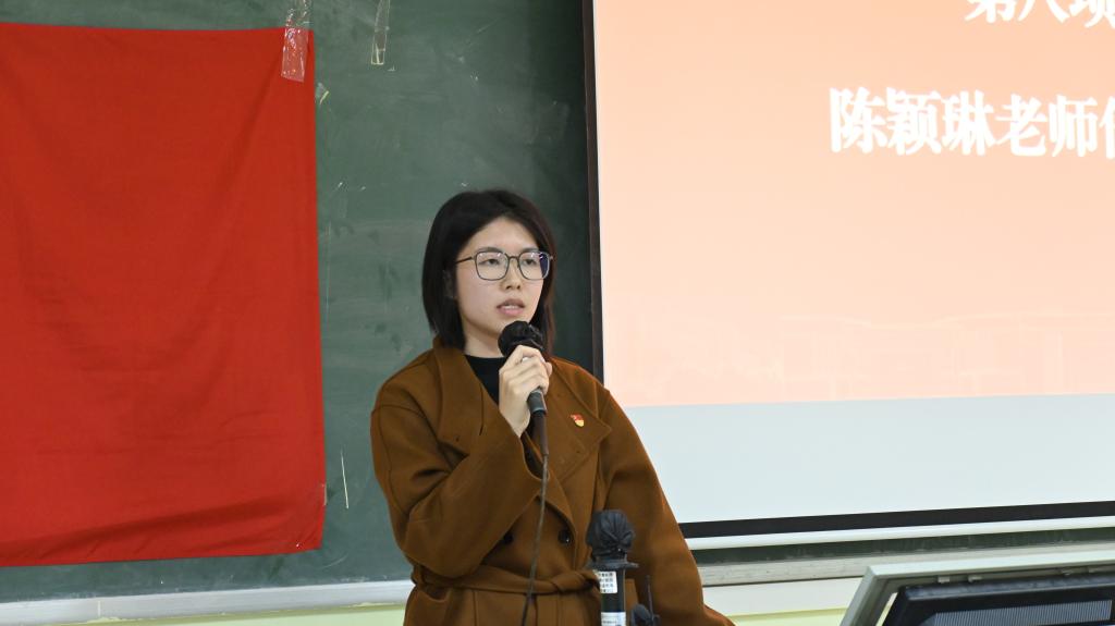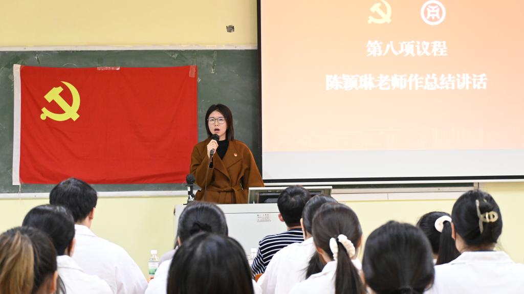 陈颖琳同志向本期转为预备党员的同志们表示热烈欢迎。她指出,新同志的加入为党支部注入了新鲜血液。她强调,从发展对象转为预备党员,不仅是身份的转换,更是责任与标准的提升。她希望同志们以此作为新的奋斗起点,始终牢记入党初心,持续筑牢信仰根基,以党员标准严格要求自己;主动投身支部建设,在工作中勇挑重担、在实践中锤炼党性,共同为推动支部建设和学校发展贡献智慧与力量。