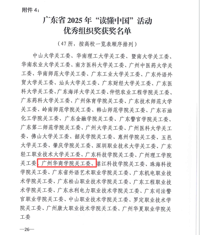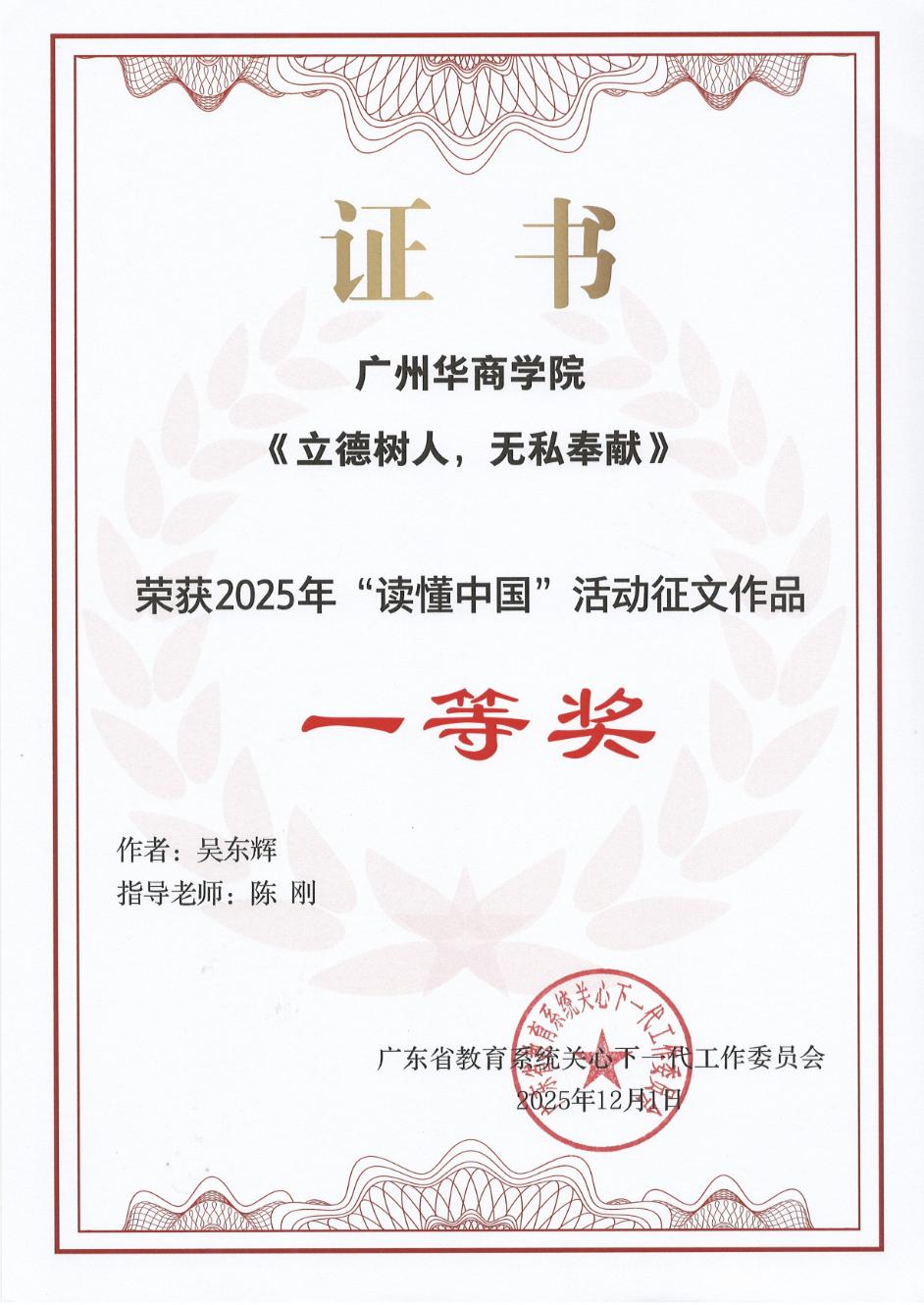 在2025年开展的“读懂中国”活动作品评审活动中,我校健康医学院24本药学1班学子吴东辉作品《立德树人 无私奉献》,荣获2025年“读懂中国”活动征文作品一等奖;广州华商学院关工委在2025年“读懂中国”活动中,荣获优秀组织奖。