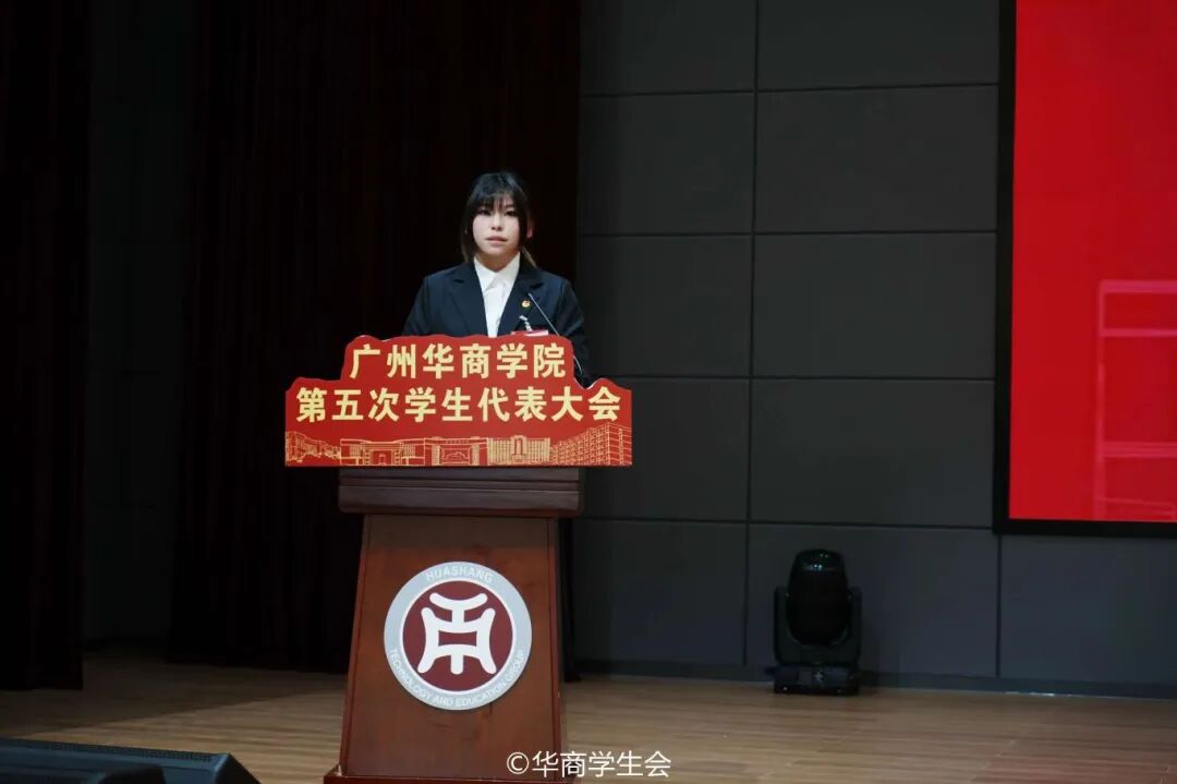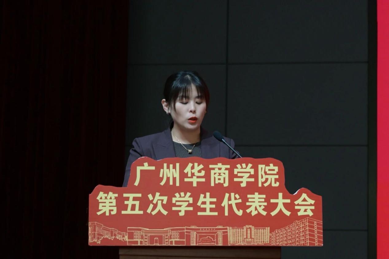 广州华商学院第四届学生会主席团成员代表张靖怡向大会作《青春聚力迎校庆,锚定方向助评估,为广东高质量发展挺膺担当贡献华商力量》工作报告,回顾了过去一年学生会在思想政治引领、服务同学成长、校园文化建设、社会实践开展等方面的成绩。