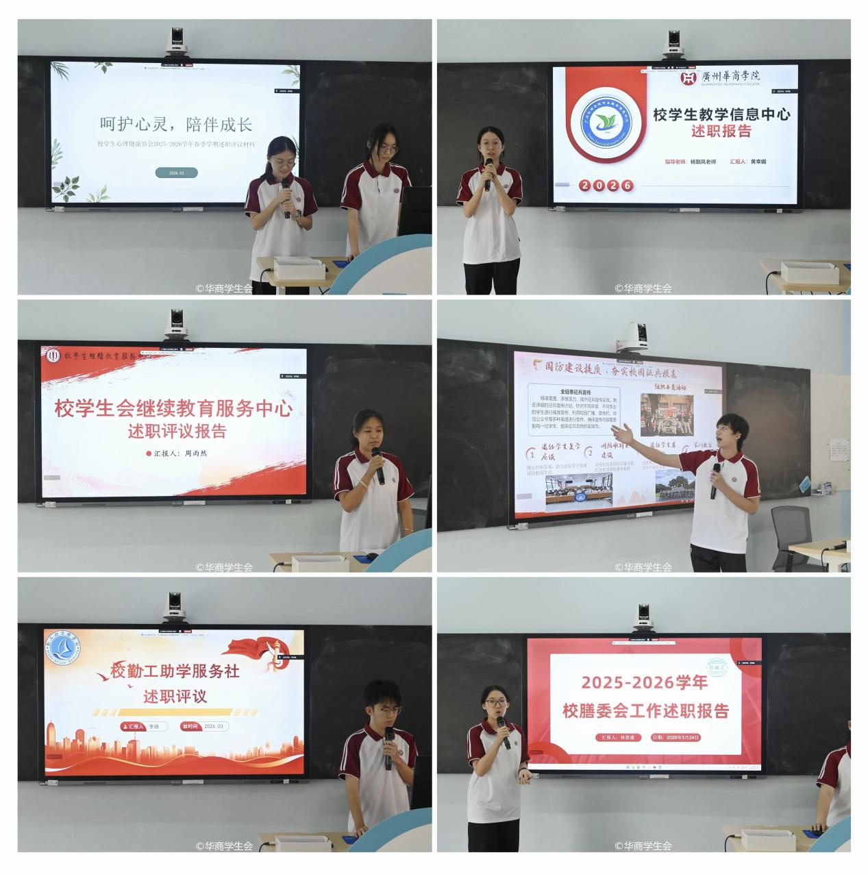 3月24日下午,广州华商学院2026年春季学期挂靠学生组织述职评议会在广州校区励志楼D203顺利召开。校党委委员、党委办公室吕书勉主任,校纪委委员、纪委办公室黄秋铭主任,校团委陈刚书记,校党委统战部王国庆副部长,学生处马卉芳副处长,校学生会指导老师杨图珍、各挂靠学生组织指导老师、校学生会学生骨干代表及各挂靠学生组织学生骨干代表共同参加会议。
